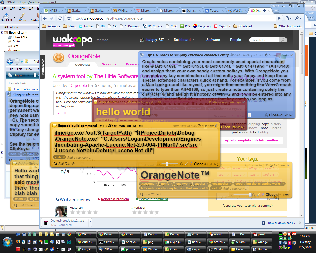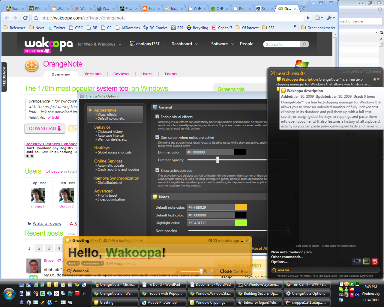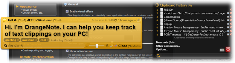 OrangeNote™ is a free WPF-based text clipping manager for Windows that allows you to store an unlimited number of fully-indexed and taggable text clippings in its database and pull them up at any time with a quick full-text search. You can assign clippings custom hotkeys and paste them into any running program, so commonly-typed things (like an address or bank card number) become as quick as a single keystroke!